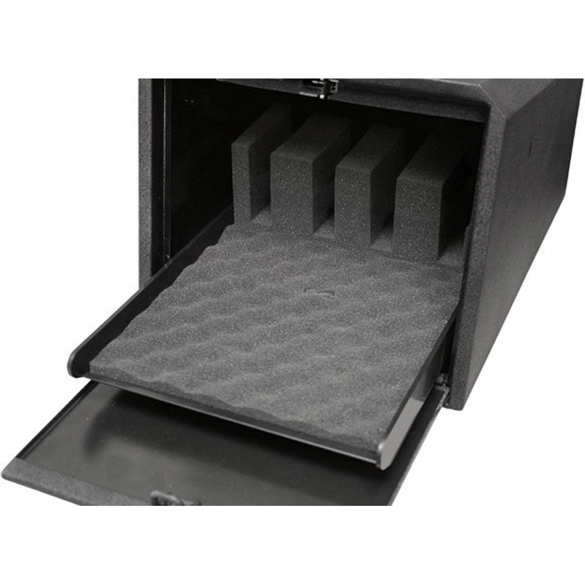 Dimensions: 10.27" x 14.02" x 8.88". Weight: 16.5lb. Interior dimensions: 8.42" x 11.49" x 5.65". Illuminated No-Eyes keypad. Door opens instantly upon correct code entry. Auto slide-out drawer. Concealed hinge and heavy-gauge steel construction for enhanced security. Foam-padded interior holds firearm in place and protects finish. Slots hold up to four pistols. Boxed.